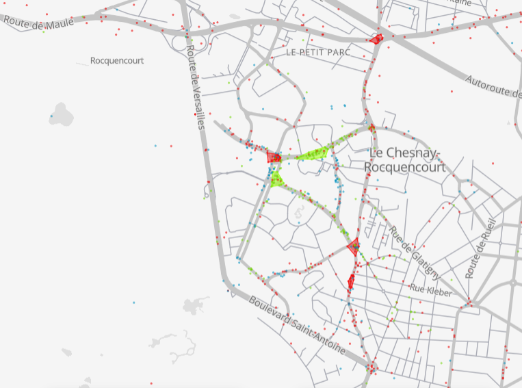 - Des kilomètres encore à parcourir : majorité des ronds points et carrefours notés dangereux (rouge sur la carte), absence d’itinéraires alternatifs lors de travaux de voirie (exemple géothermie), manque d’écoute de la part de la mairie.