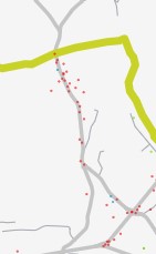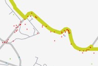 Route de Belleville. Chaque point rouge correspond à un endroit dangereux signalé par une personne ayant répondu au Baromètre des villes cyclables
