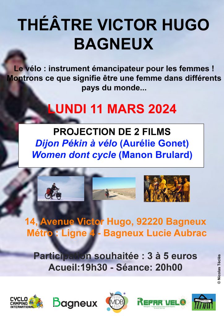 organisent avec le théâtre Victor Hugo de Bagneux une séance de cinéma dédiée aux femmes voyageuses à vélo ; peu de temps après la journée des femmes du 8 mars organisée par l’ONU.