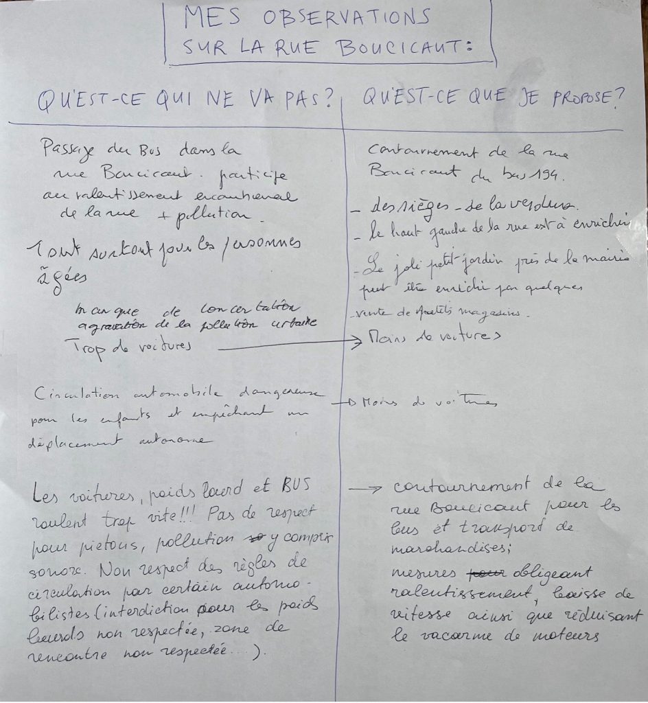 - La promesse du maire d’ouvrir un comité thématique sur la rue Boucicaut est à prendre avec précaution, car en 2019 le maire a déjà ouvert un comité thématique sur la circulation sans aucune prise en compte de leurs 53 recommendations. Malgré son engagement de mettre en œuvre la moitié des 53 propositions et de mettre en place un comité de suivi, il n’a rien fait (voir ici). S’agirait-il de faire travailler de nouveau un comité pendant un an et demi jusqu’aux élections municipales pour ne publier que les photos des groupes de travail mais sans rien faire de leur travail ? J’invite le maire à prouver une ouverture et une écoute réelles.