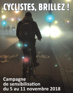 Gennevilliers : action de sensibilisation avec distribution de catadioptres. De 18h à 19h au niveau de la station de métro les Agnettes. Puis de 19h à 20h déambulation lumineuse avec pour finir un apéro tiré du sac ! S’inscrire à l’évènement sur Facebook.