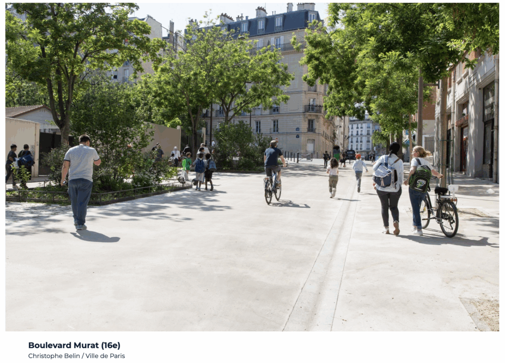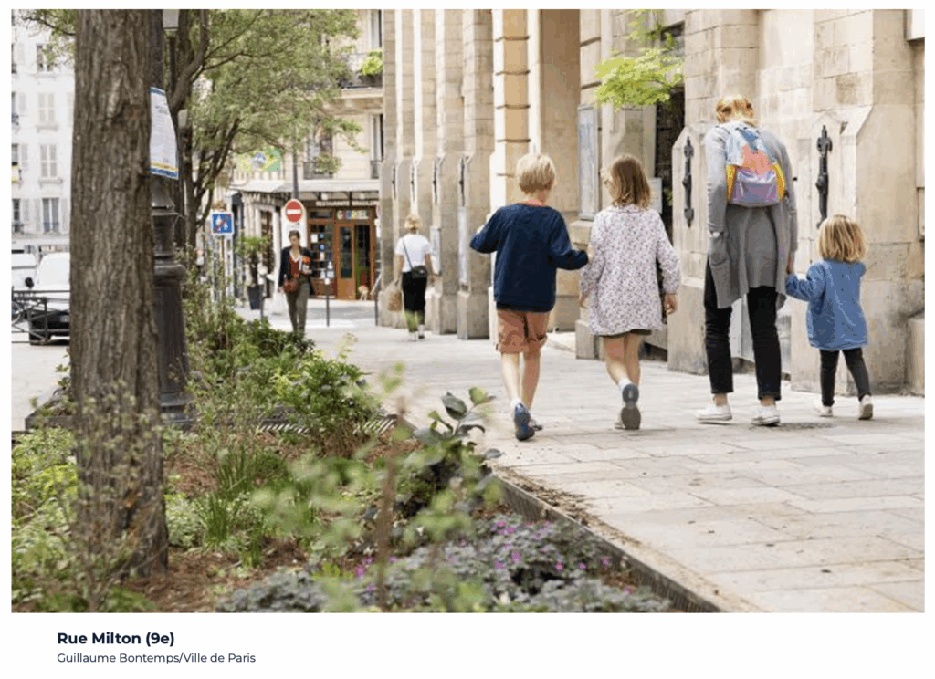 Parmi les 300 rues aménagées, 100 « rues aux écoles » bénéficient d’un programme d’aménagement spécifique. L’aménagement piétonnier se fait en revêtement clair. Lorsque c’était possible techniquement, la ville de Paris a installé de vastes espaces végétalisés pleine terre avec plantations d’arbres. Ces aménagements participent à la réduction des îlots de chaleur nocturnes.