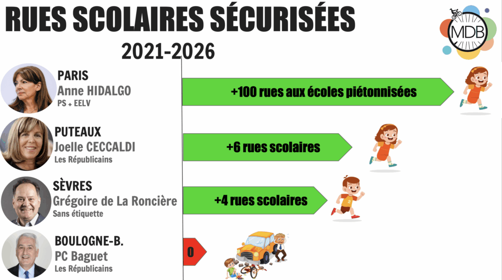 Les rues aux écoles se multiplient partout dans le monde depuis la crise Covid19. Pourtant, la ville de Boulogne-Billancourt refuse toujours de fermer la circulation dans les rues scolaires. Elles sont pourtant recommandés par le Cerema, agence de l’État chargé de l’aménagement des territoires. Il existe 2 formats. Une version temporaire à l’heure des écoliers. Une version définitive par piétonnisation et végétalisation de la rue. Ces 2 versions permettent de sécuriser les trajets des enfants. Au-delà de la sécurité routière, cela permet aussi de lutter contre la pollution de l’air et la sédentarité des enfants.