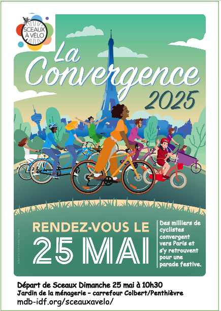 Comme chaque année, Sceaux à vélo participe à la Convergence. Organisée par MDB, la Convergence rassemble plusieurs milliers de cyclistes qui, de toute l’Île-de-France, convergent vers le centre de la capitale. Plus de 100 départs sont organisés dans toute la région et l’un des convois traverse Sceaux avec un point de rendez-vous sur la ville en fin de matinée. Arrivée au centre de Paris, c’est alors un pique-nique géant de plusieurs milliers de cyclistes qui, une fois restaurés, réenfourchent leur vélo pour, tous ensemble, faire un petit tour remarqué dans la capitale. Applaudis par les passants et les touristes mais pas toujours par les automobilistes !