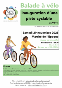 Samedi 29 novembre, rendez-vous à 8h30 au marché de l’Epoque (niveau parking à vélos) destination la base de loisirs de Vaires – Torcy via Chelles et inauguration de pistes cyclables sur le VIF 4, réseau Vélo Ile-de-France Piste n°4 qui ira de Val d’Europe à Cergy-Pontoise.