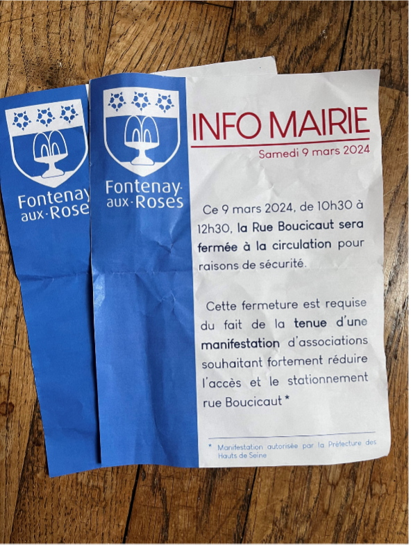 Suite au lancement d’un projet pour la rue Boucicaut à Fontenay-aux-Roses par le maire Laurent Vastel, une manifestation a eu lieu le 9 mars 2024. Cette manifestation visait à obtenir une concertation sur le devenir de la rue et un réel apaisement de la rue.